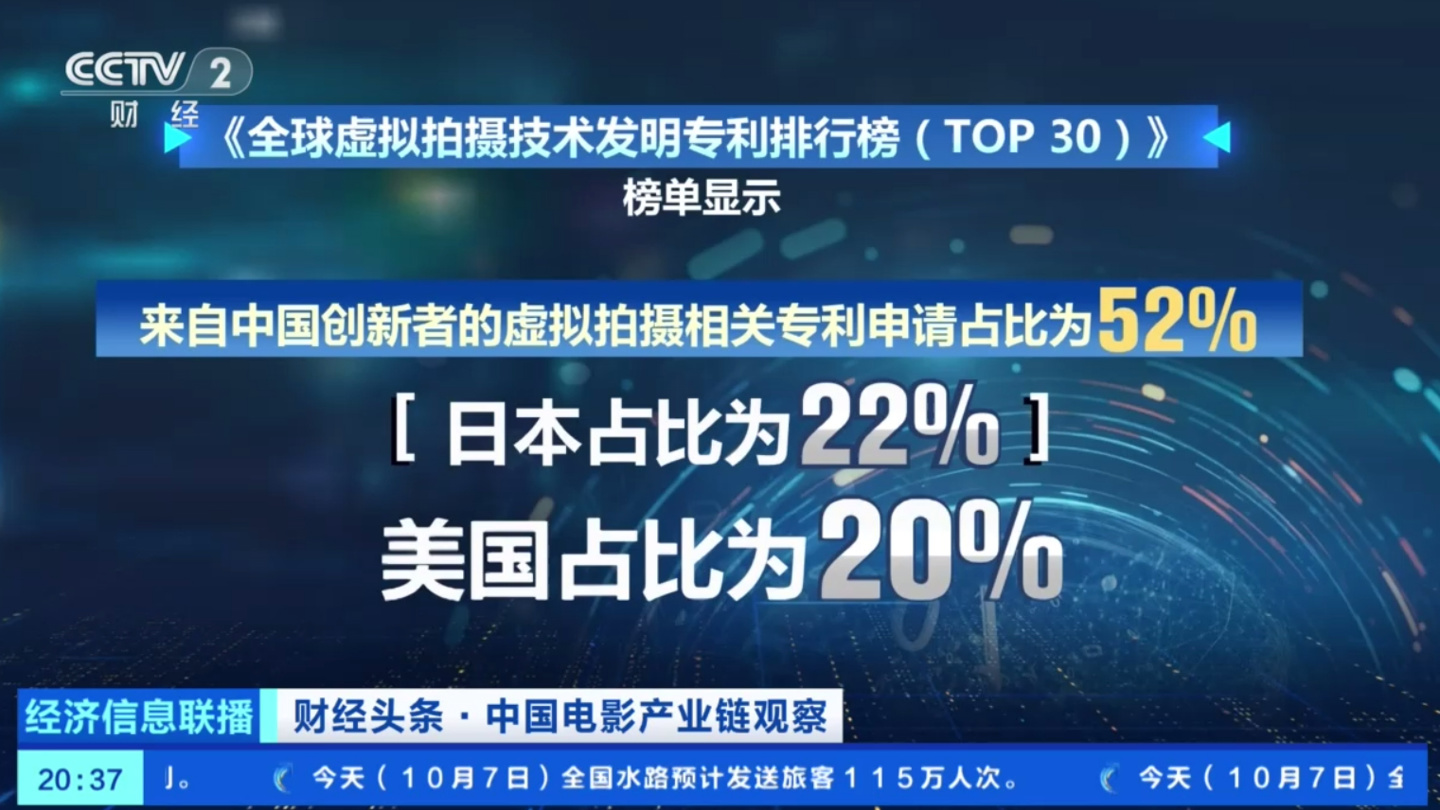 10 月 7 日消息,今年是中国电影诞生 120 周年。据央视财经今日报道,在知名知识产权分析机构发布的《全球虚拟拍摄技术发明专利排行榜》榜单中显示,来自中国创新者的虚拟拍摄相关专利申请占比为 52%,日本占比为 22%,美国占比为 20%。