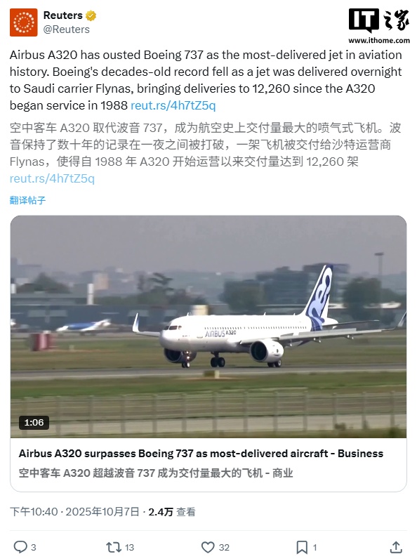 至此,空客 A320 系列机型交付量首度超越波音 737 系列,成为航空史上交付量最多的喷气式客机。
