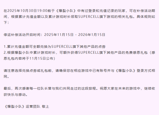 在 2025 年 10 月 30 日 19:00 前于《爆裂小队》中有过登录和充值记录的玩家,可在补偿活动期间,根据累计充值金额以及累计游戏时长领取 SUPERCELL 旗下游戏的相关礼包。具体规则如下: