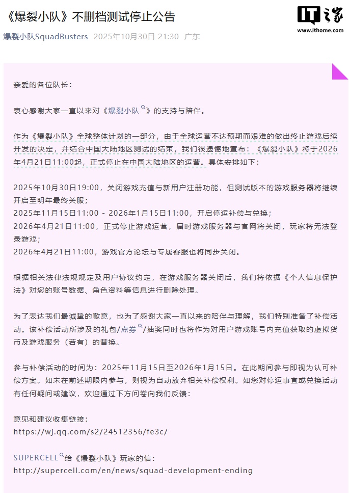 10 月 31 日消息,Supercell《爆裂小队》昨晚发布公告,由于全球运营不达预期而艰难地作出终止游戏后续开发的决定,并结合中国大陆地区测试的结束,《爆裂小队》将于 2026 年 4 月 21 日 11:00 起,正式停止在中国大陆地区的运营。