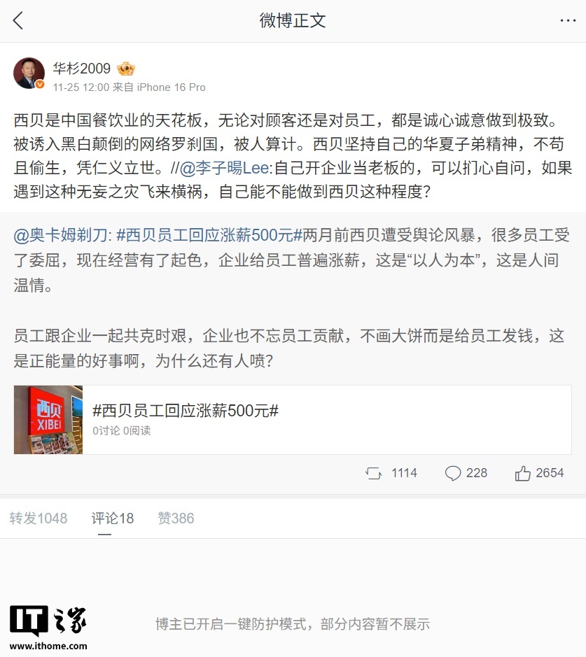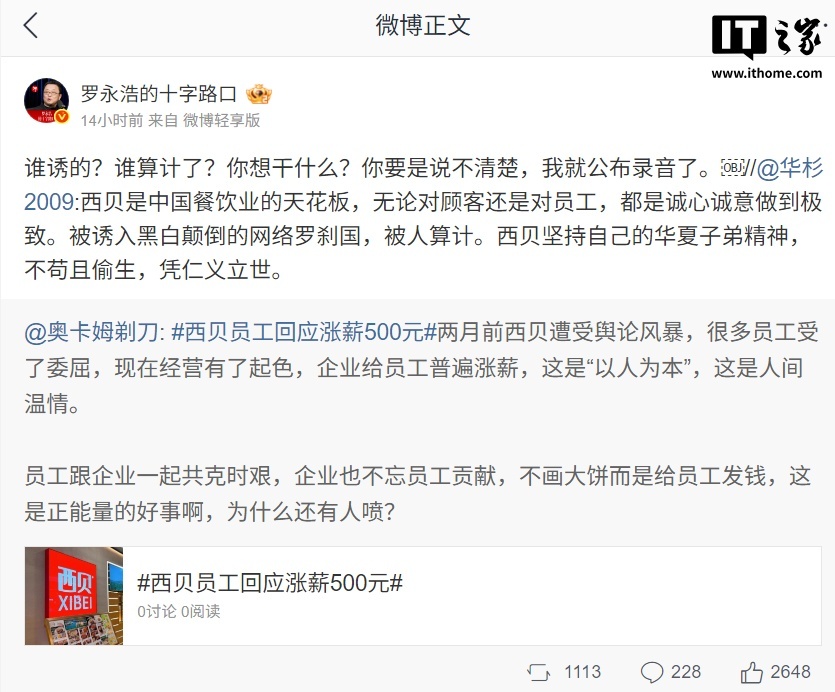 罗永浩与西贝关于“预制菜”的争论已告一段落,如今西贝全国门店产品降价调改,并对员工平均涨薪 500 元的消息传出,引发网络热议。西贝品牌顾问、华与华营销咨询有限公司董事长华杉昨日在微博表示: