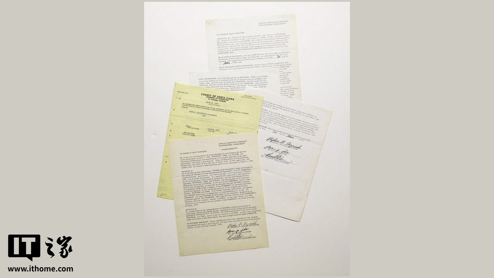 佳士得此次将把创始合伙协议与韦恩退出协议作为单一拍品进行拍卖。值得注意的是,韦恩于 20 世纪 90 年代初曾以 500 美元的价格出售过该创始协议的纸质原件;而苹果公司原始注册文件上一次现身拍场是在 2011 年 12 月,由苏富比拍卖行拍出,当时该拍品亦包含韦恩的退出协议,最终以近 160 万美元的价格被一位私人藏家购得。
