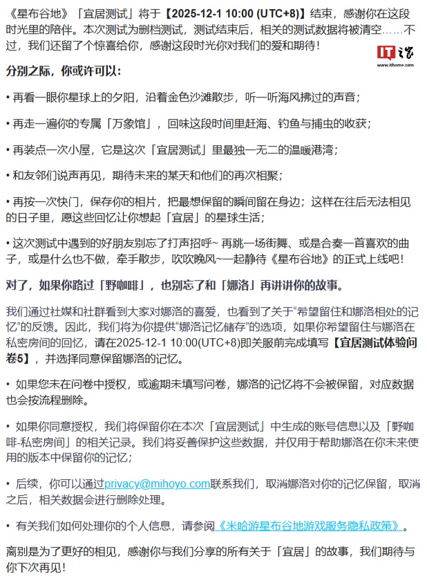 11 月 26 日消息,米哈游官方今日在米社区发布了《星布谷地》「宜居测试」关服预告。据介绍,「宜居测试」将于 2025 年 12 月 1 日 10:00 结束。本次测试为删档测试,测试结束后,相关的测试数据将被清空。