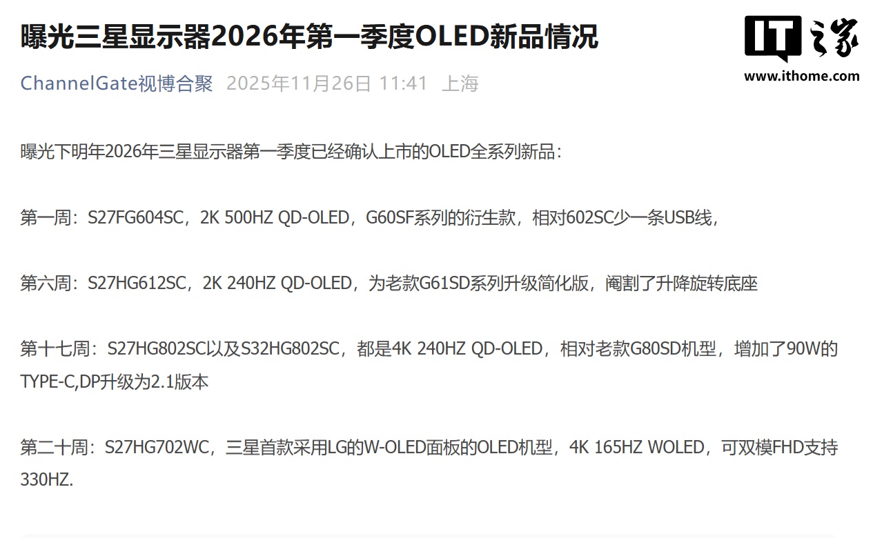 11 月 27 日消息,公众号“ChannelGate 视博合聚”昨日(11 月 26 日)发布博文,曝光了三星显示器 2026 年第 1 季度 OLED 新品情况,其中最值得关注的是,将首次采用其主要竞争对手 LG Display 的 WOLED 面板。