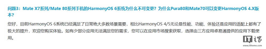查询获悉,对于“Mate X7 系列 / Mate 80 系列手机的 HarmonyOS 6 系统为什么不可变更?为什么 Pura 80 和 Mate 70 可以变更 HarmonyOS 4.X 版本?”的问题,华为官网进行了解释: