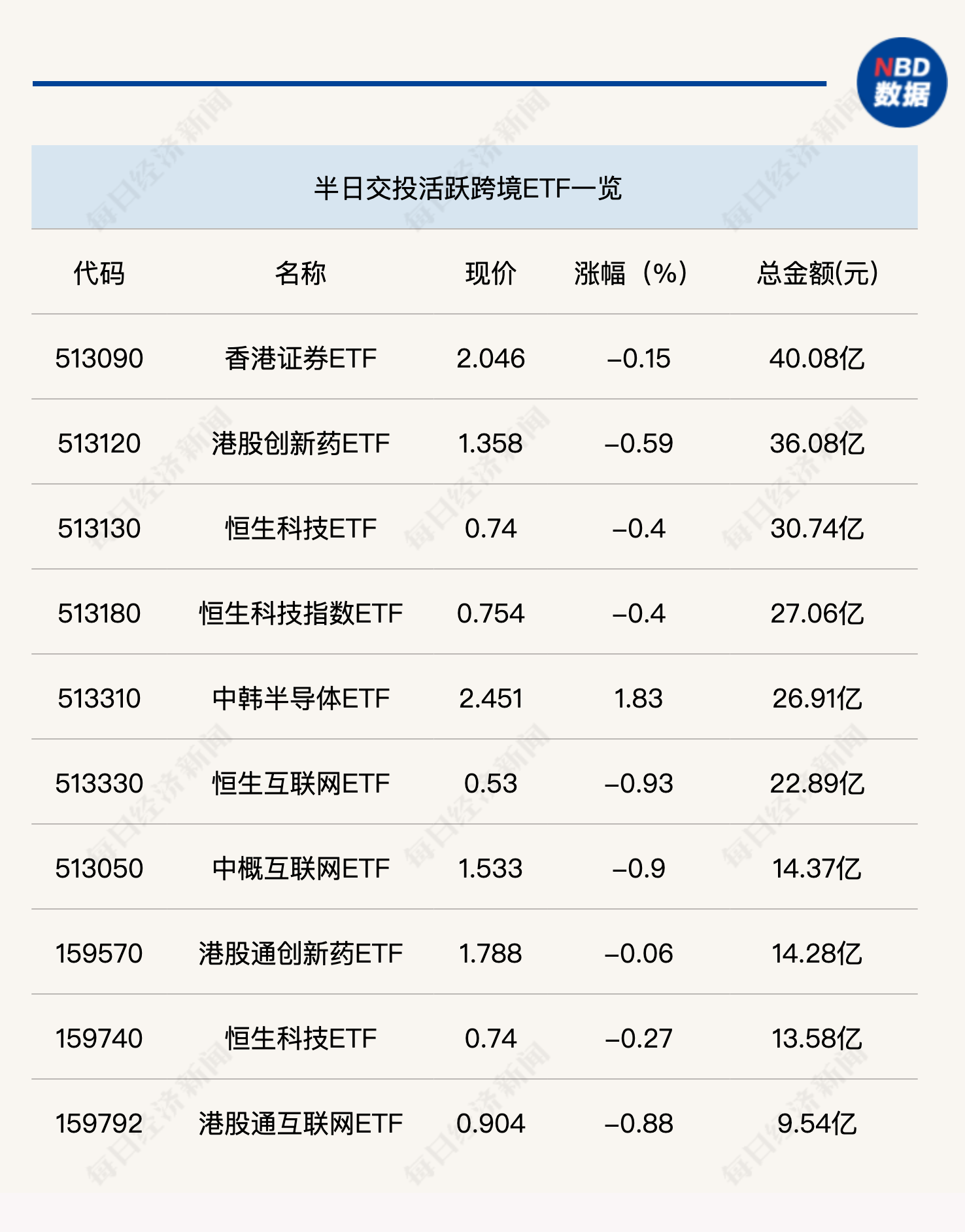 今日上午,科创芯片ETF(588200)继续保持活跃,半日成交金额达到26亿元;通信ETF(515880)和半导体ETF(512480)半日成交金额也均在10亿元以上。跨境ETF方面,今日上午出现明显缩量,仅香港证券ETF(513090)成交金额达到40亿元。