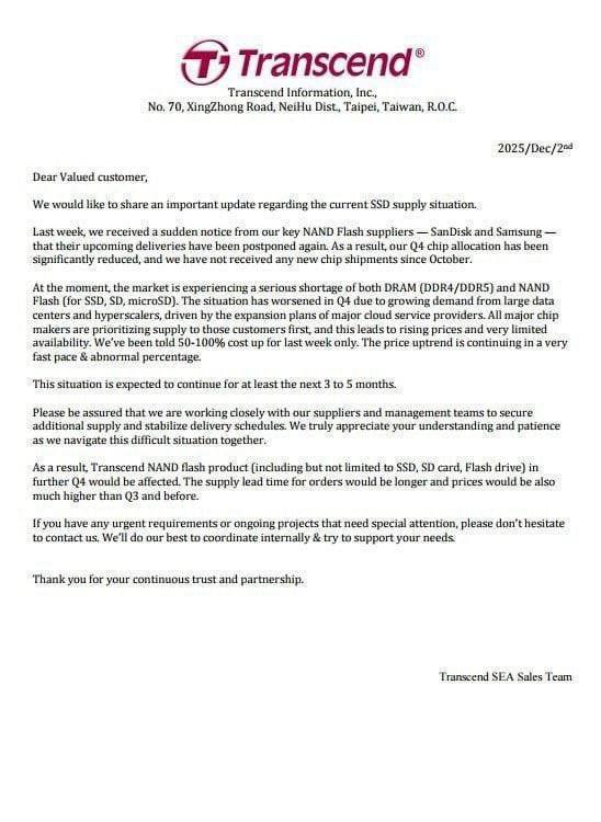 12 月 3 日消息,全球 NAND Flash 市场供应持续吃紧,消息人士 @jukan05 今日放出了一份存储厂商创见(Transcend)向合作伙伴发出的内部通知。
