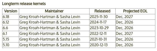 根据 Linux 稳定分支主要维护者 Greg Kroah-Hartman 今日提交的更新,6.18 版本已被正式列入 kernel.org 的 LTS 版本名单,由 Greg Kroah-Hartman 与 Sasha Levin 共同维护。