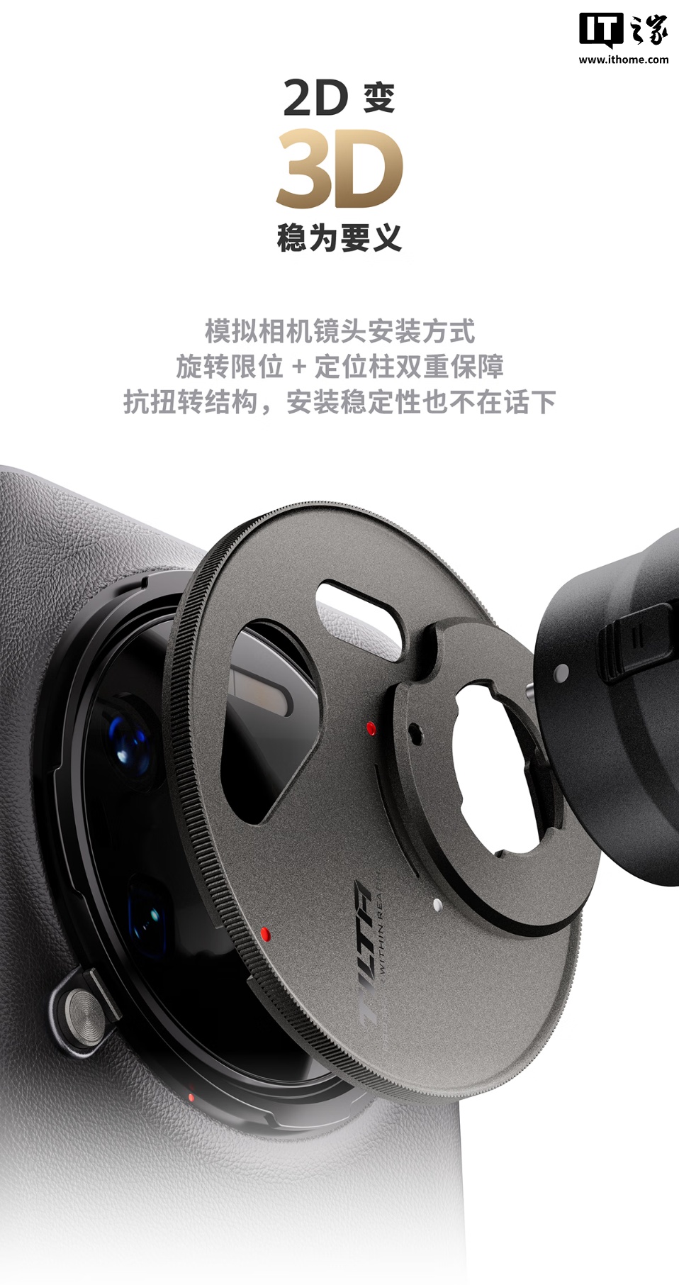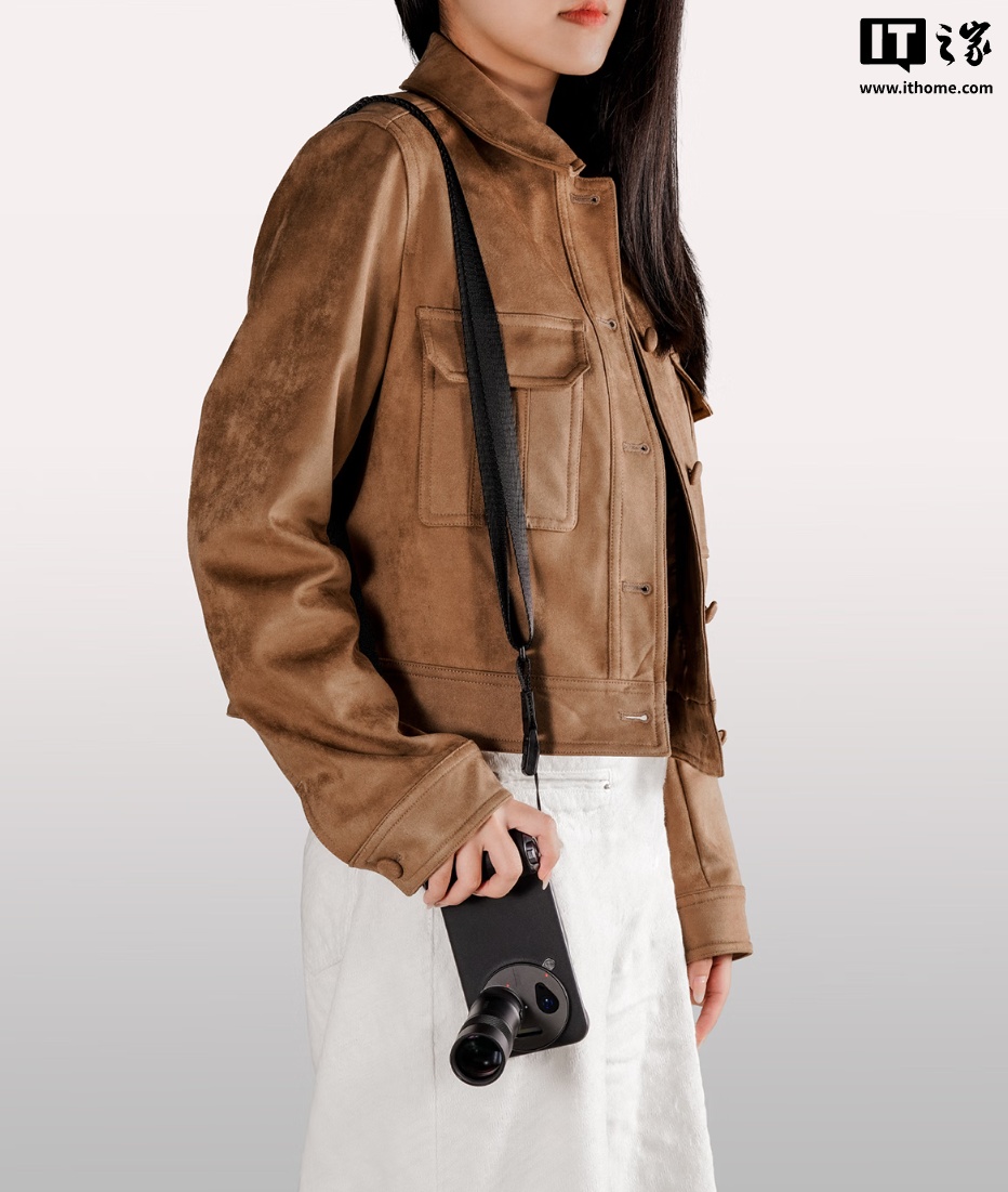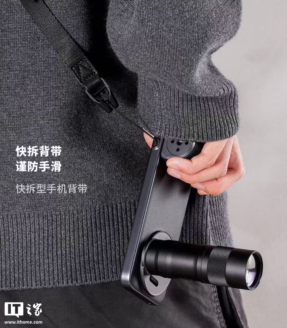 据介绍,这款摄影套装兼容系统相机应用,无需第三方 App 即可使用,带有一枚 3.33X 光学镜头,可帮助用户拍摄到更远距离物体,镜头与手机之间采用手机壳固定的方式安装,其中手机壳的后摄模组部分带有三爪式卡口,带来充足稳定性。