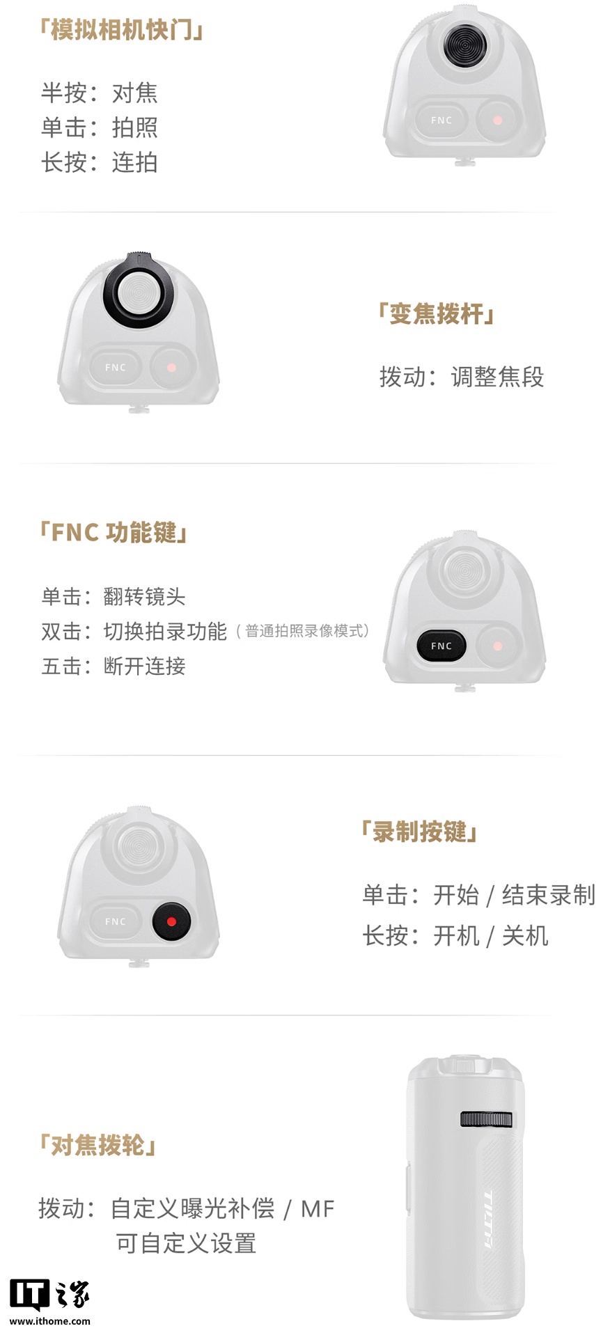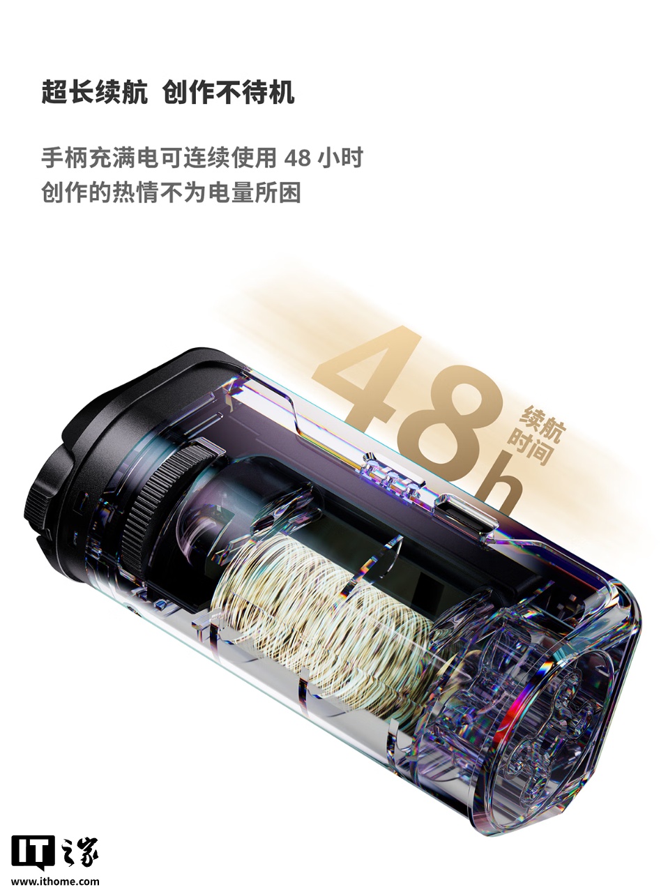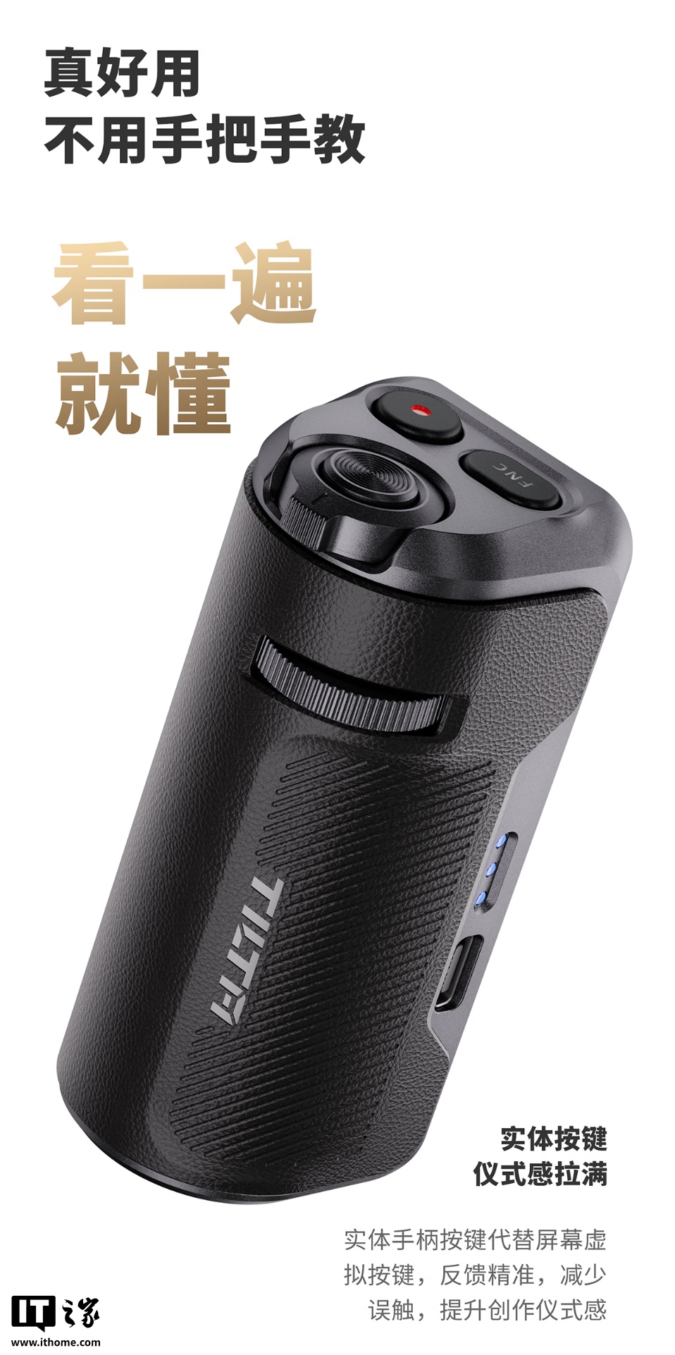 这款摄影套装的手柄带有实体快门按键,支持与相机一样的半按对焦 / 全按拍照操作,还拥有变焦拨杆、录制键、波轮、功能键,可带来更加便捷的调参体验,手柄与机身之间采用蓝牙连接,最远遥控距离可达 40 米,内置电池可连续使用 48 小时。