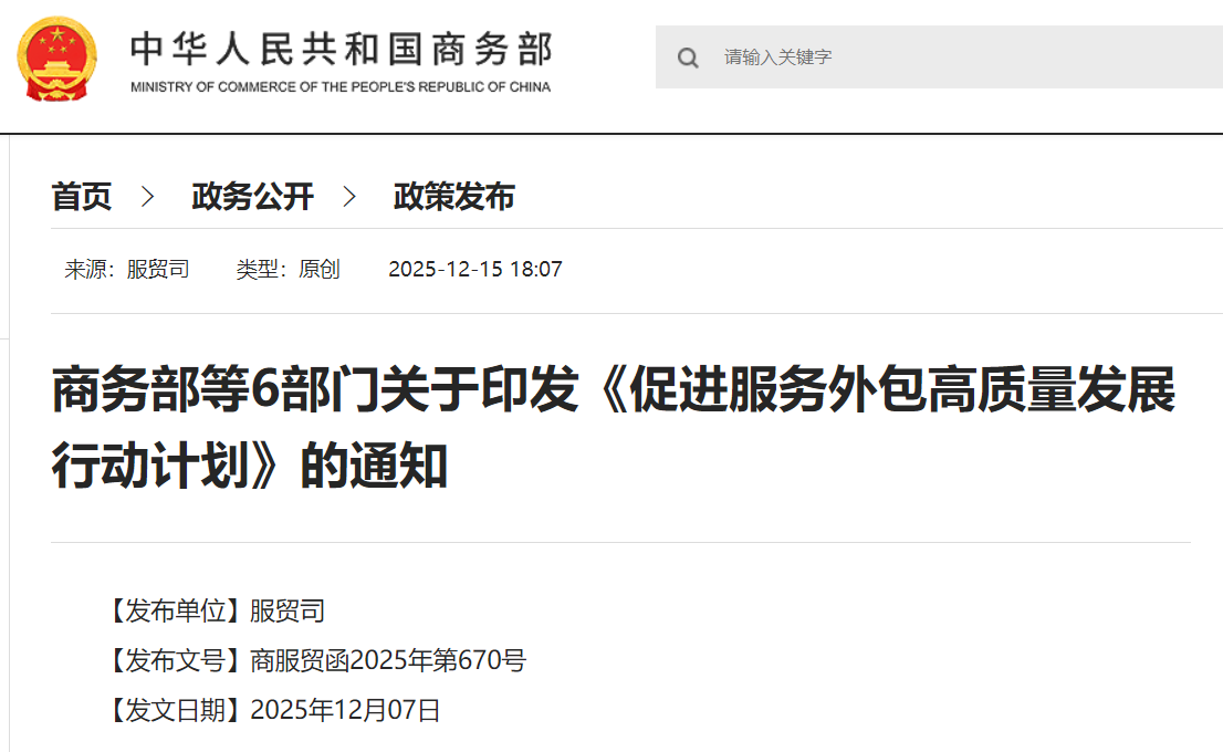 12 月 15 日消息,商务部等 6 部门今日发布关于印发《促进服务外包高质量发展行动计划》的通知,目标到 2030 年,培育一批具有国际竞争力的服务外包龙头企业,建设一批创新能力强、特色优势产业明显的服务外包集聚区,服务外包数字化、智能化、绿色化、融合化发展水平进一步提升,吸纳就业人数显著增长。服务外包成为创新提升服务贸易、创新发展数字贸易的重要组成部分。