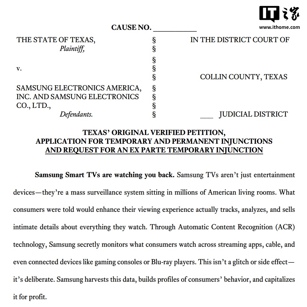 12 月 17 日消息,科技媒体 Ars Technica 今天(12 月 17 日)发布博文,报道称美国得克萨斯州总检察长肯・帕克斯顿(Ken Paxton)起诉三星、LG、索尼、海信和 TCL 五大电视制造商,指控其利用自动内容识别(ACR)技术,在未经用户知情同意的情况下进行“大规模监视”。
