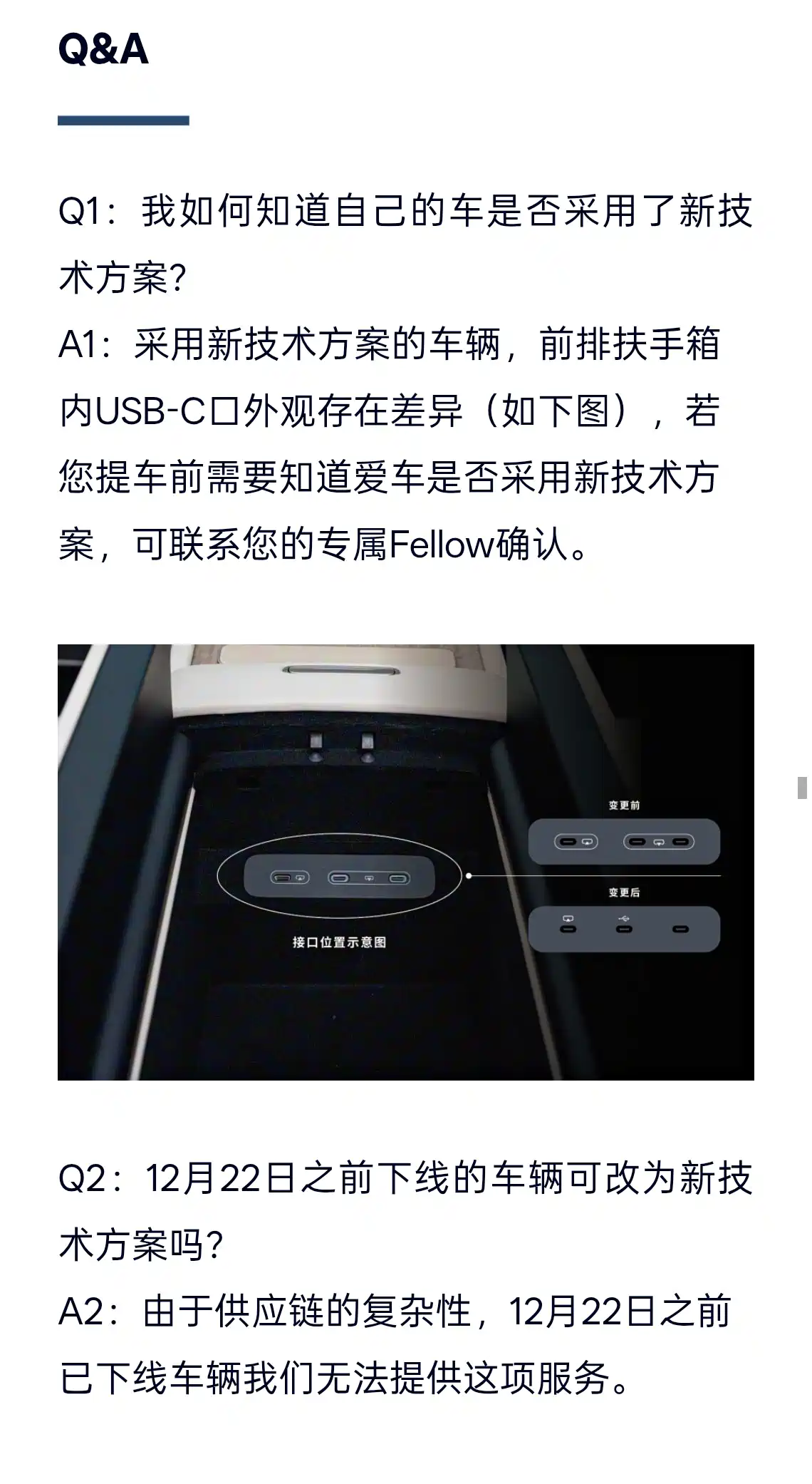 A2:采用新技术方案的车辆,前排扶手箱内 USB-C 口外观存在差异(如上图),若提车前需要知道是否采用新技术方案,可联系专属 Fellow 确认。