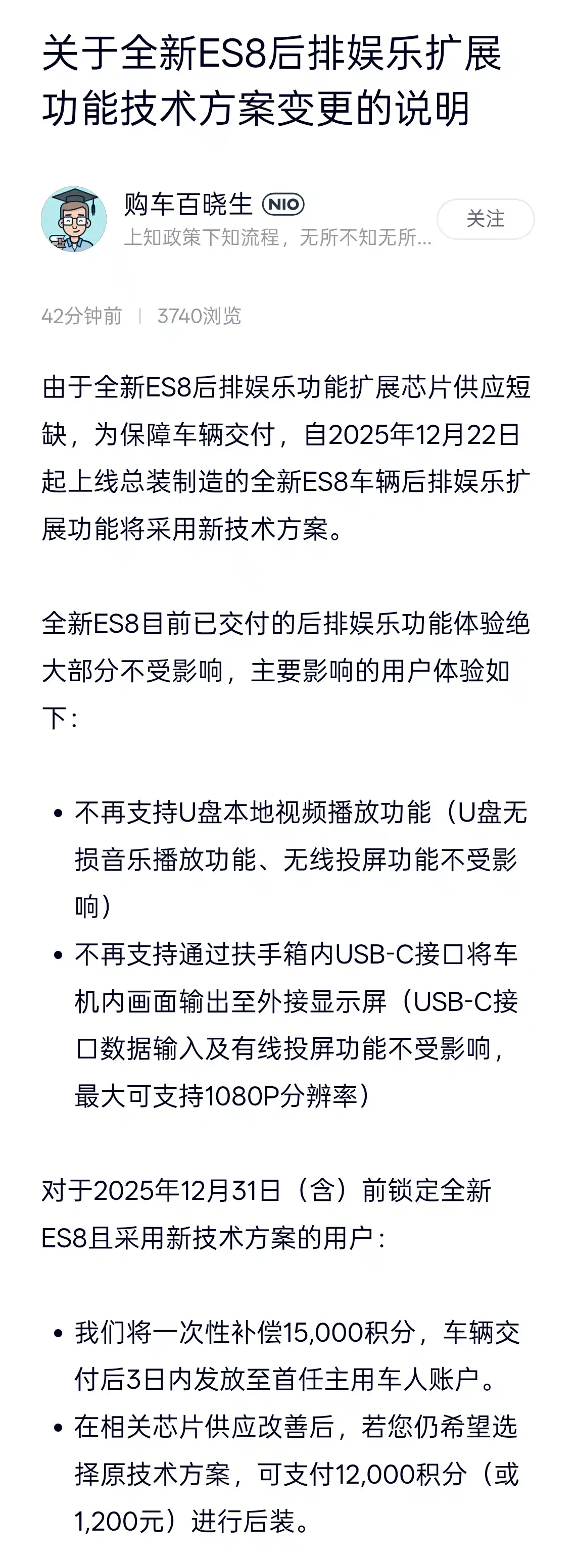 与此同时,对于 2025 年 12 月 31 日(含)前锁定全新 ES8 且采用新技术方案的用户:将一次性补偿 15000 积分,车辆交付后 3 日内发放至首任主用车人账户;在相关芯片供应改善后,若您仍希望选择原技术方案,可支付 12,000 积分(或 1,200 元)进行后装。