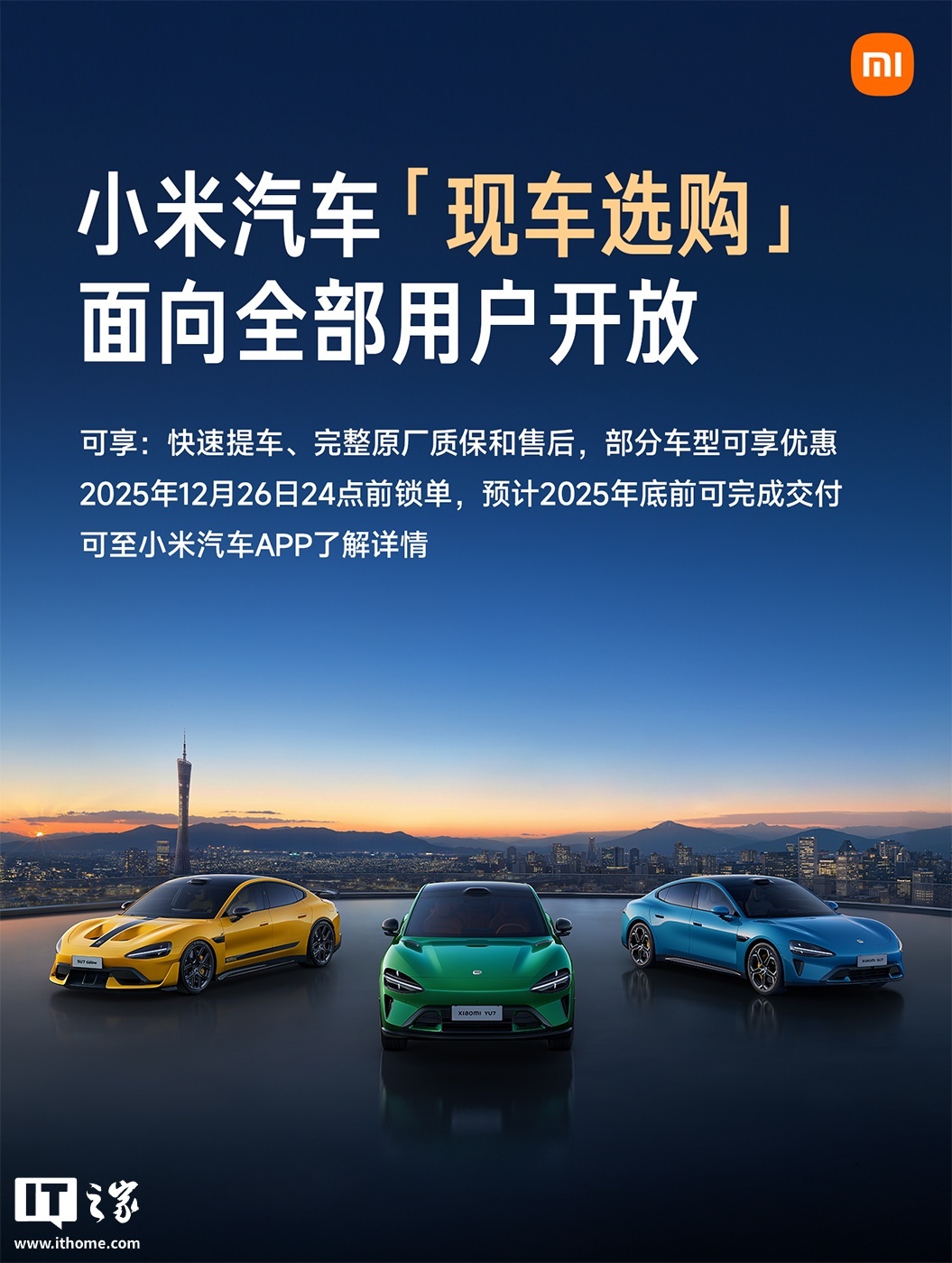 注意到,小米汽车「现车选购」功能已于 12 月 3 日 10 点面向全部用户开放,支持快速提车、完整原厂质保和售后,部分车型可享优惠。2025 年 12 月 26 日 24 点前锁单,预计 2025 年底前可完成交付。