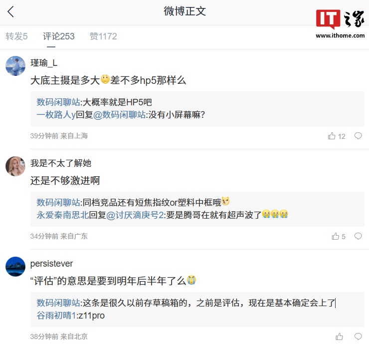 博主还在评论区回复了部分网友的问题:针对主摄到底是多大,他表示:“大概率就是 HP5 吧。”针对新机不够激进的评论,他回复:“同档竞品还有短焦指纹 or 塑料中框哦。”针对评估是否指代明年后半年的意思,他称:“这条是很久以前存草稿箱的,之前是评估,现在是基本确定会上了。”
