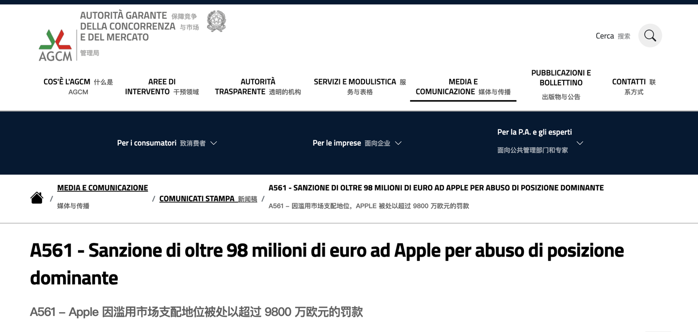 因“滥用市场支配地位”,苹果被意大利监管机构罚款近 1 亿欧元苹果意大利反垄断