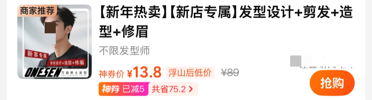 天猫美团 1200 元神券包年卡含 240 张 5 元无门槛可膨胀神券 19.9 元直达链接以一乖公司周边理发店 * 为例,美团价格 18.8 元,叠加 5 元神券后直降至 13.8 元,非常划算: