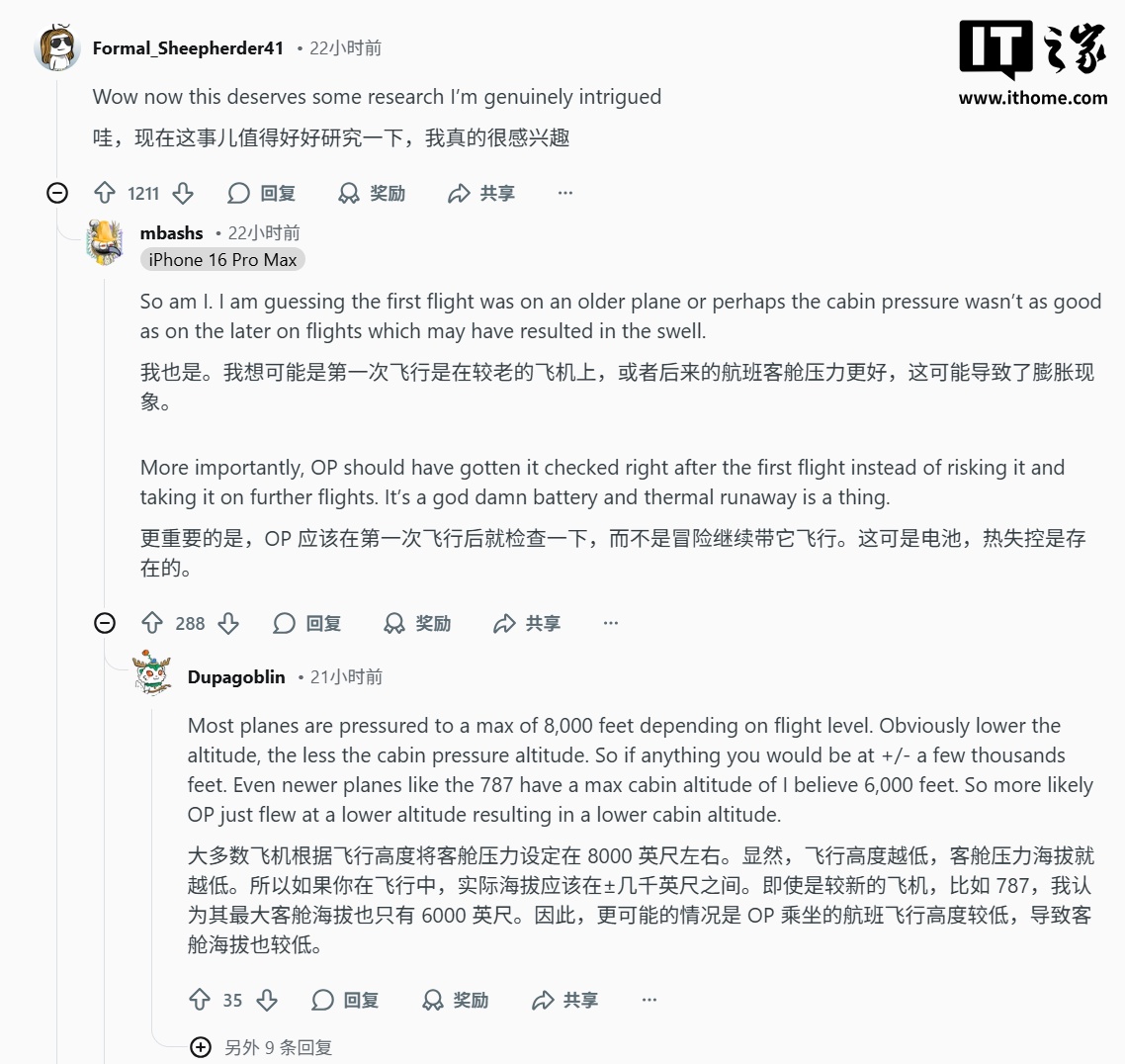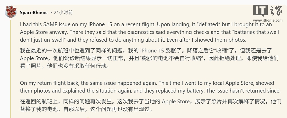 而另一名用户则表示,他的 iPhone 15 在两次不同的飞行中都出现了鼓包现象,后续他换了电池就彻底没有复现过这种现象。