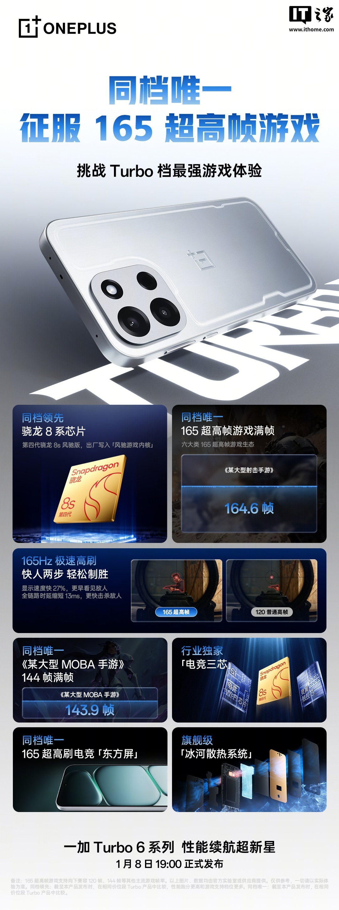 据此前报道,一加 Turbo 6 系列新机定档 1 月 8 日晚 7 点发布,外观已经公开,可选追光银、旷野绿、独行黑三款配色。一加 Turbo 6 搭载第四代骁龙 8s 风驰版处理器,出厂写入“风驰游戏内核”,AnTuTu 跑分可达 260 万分。