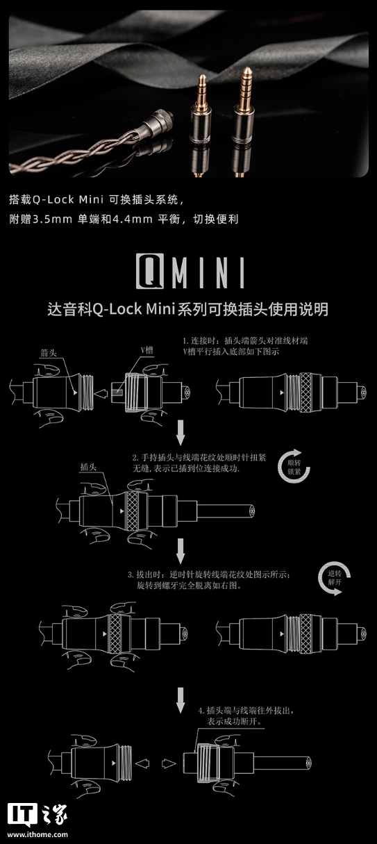 设计方面,这款耳机的声学腔体由黑格打造,自带凹陷式 0.78 2pin 标准插针,兼容各种常见 Hi-Fi 线材,自带线采用单晶镀铜银材质,拥有 Q-Lock Mini 可换插头系统,支持切换 3.5mm 单端 / 4.4mm 平衡插头,让不同设备都能使用。