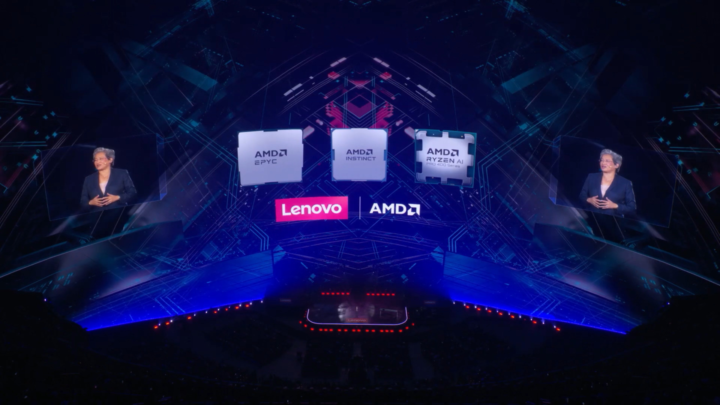 还注意到,AMD 董事会主席及首席执行官苏姿丰在联想 Lenovo Tech World 活动上演讲时,舞台背景中也出现了锐龙 AI PRO 400 系列商用桌面处理器。