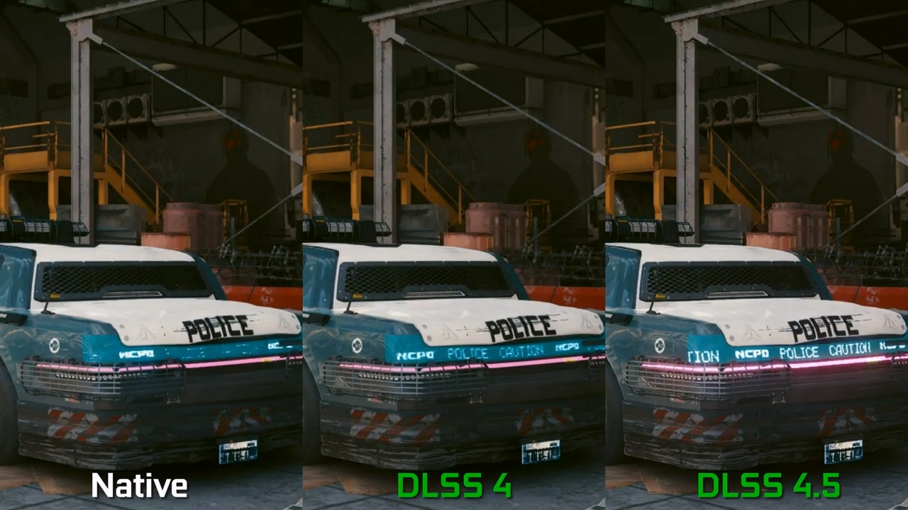 MxBenchmarkPC 还测试了开启路径追踪的《赛博朋克 2077》。结果表明,DLSS 4.5 虽然修复了地面纹理模糊的问题,但也因过度锐化引入了新的视觉噪点。