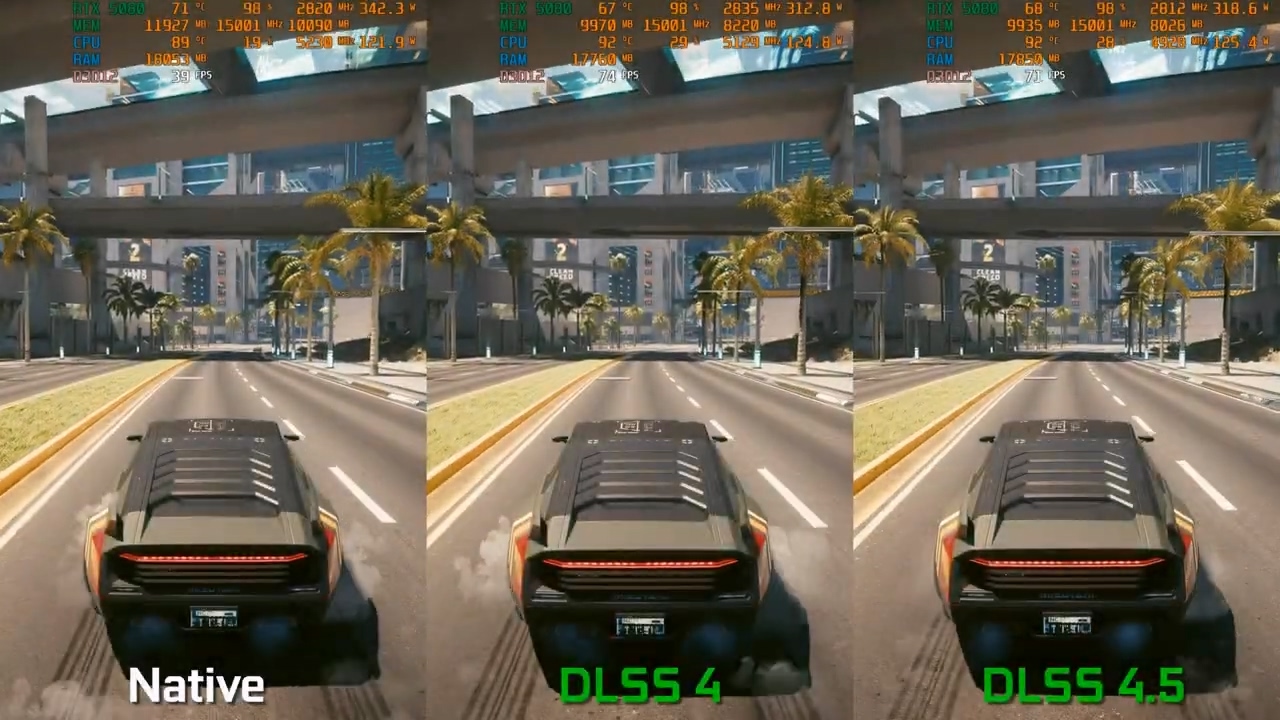 YouTube 频道 MxBenchmarkPC 昨日(1 月 7 日)发布 3 段视频,在英伟达 RTX 5080 显卡上,通过《荒野大镖客:救赎 2》、《赛博朋克 2077》等游戏测试,对比 DLSS 4.5 和 DLSS 4 之间的差异。