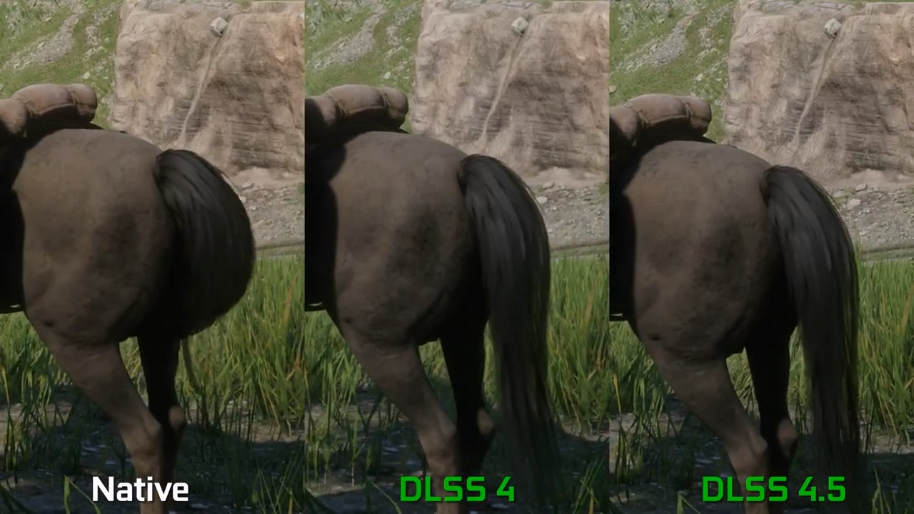 测试《荒野大镖客:救赎 2》的最高画质后,该频道主播指出开启 DLSS 4.5 质量模式后,游戏画面的清晰度不仅显著优于 DLSS 4,甚至在地形纹理和草地细节的表现上超越了原生分辨率。