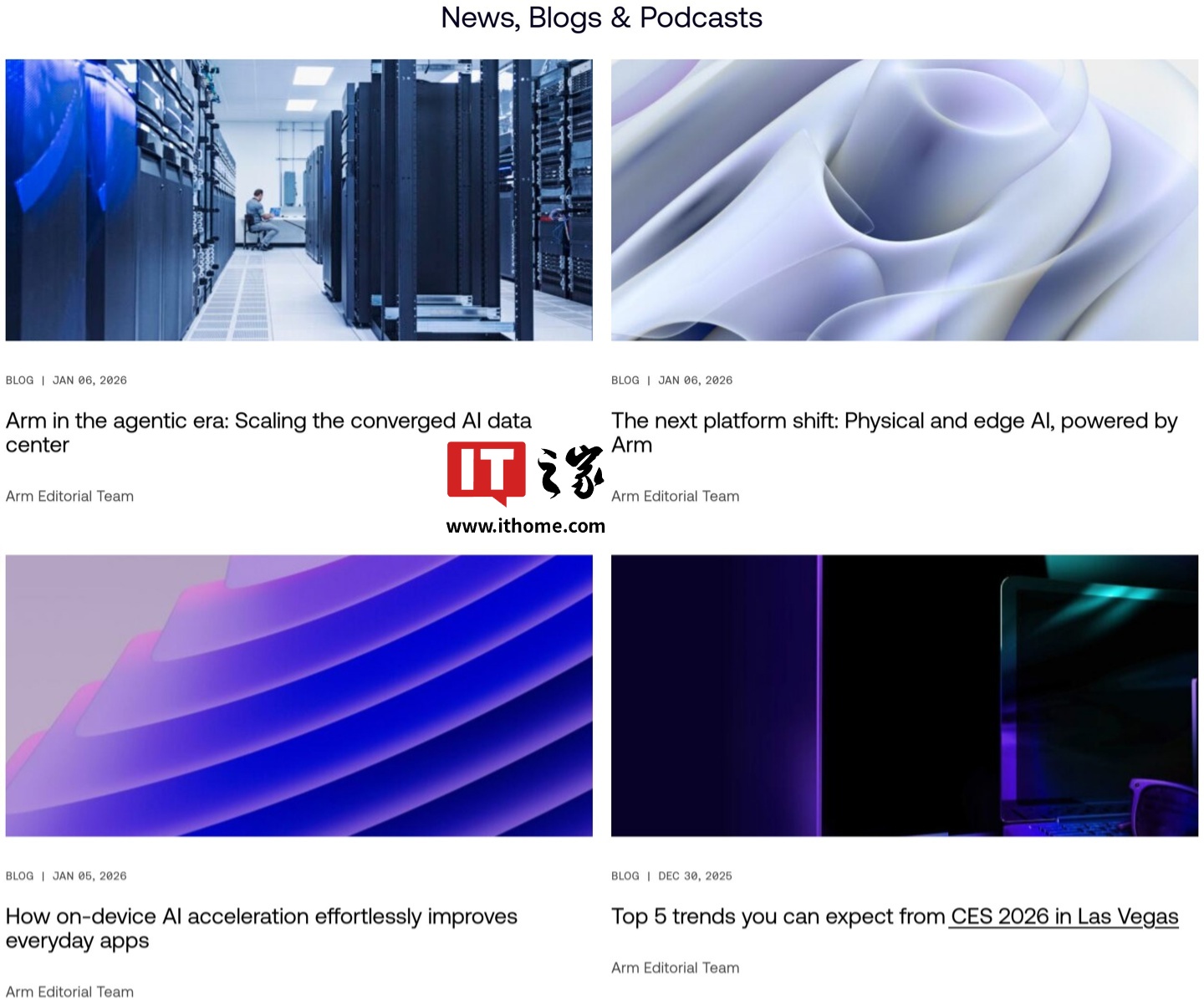 注意到,Arm 官网新闻室首页展示的博客也是数据中心、边缘计算、物理 AI 三大主题各有一篇: