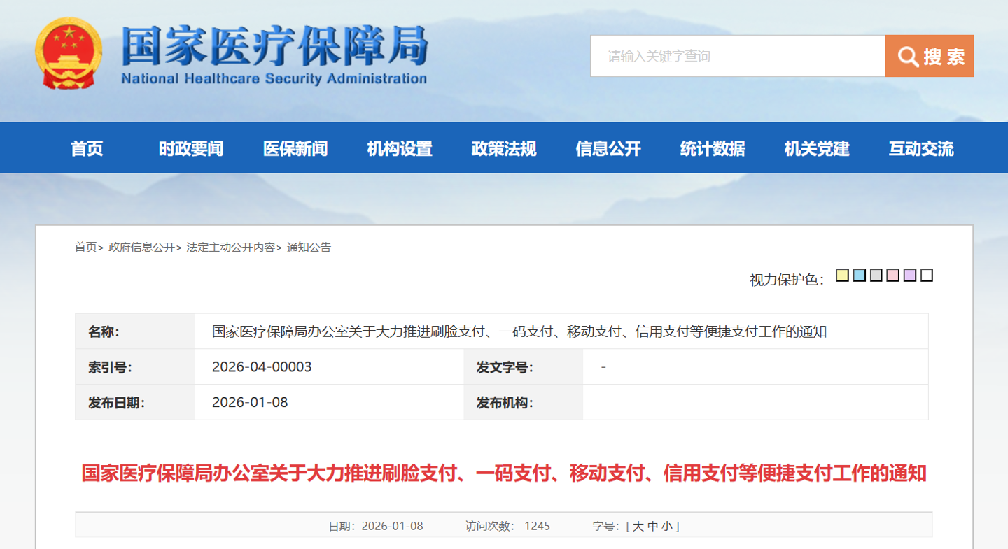 1 月 8 日消息,聚焦群众看病缴费“多次排队”“排长队”等堵点痛点,国家医保局办公室 1 月 8 日发布《关于大力推进刷脸支付、一码支付、移动支付、信用支付等便捷支付工作的通知》(下称《通知》)。