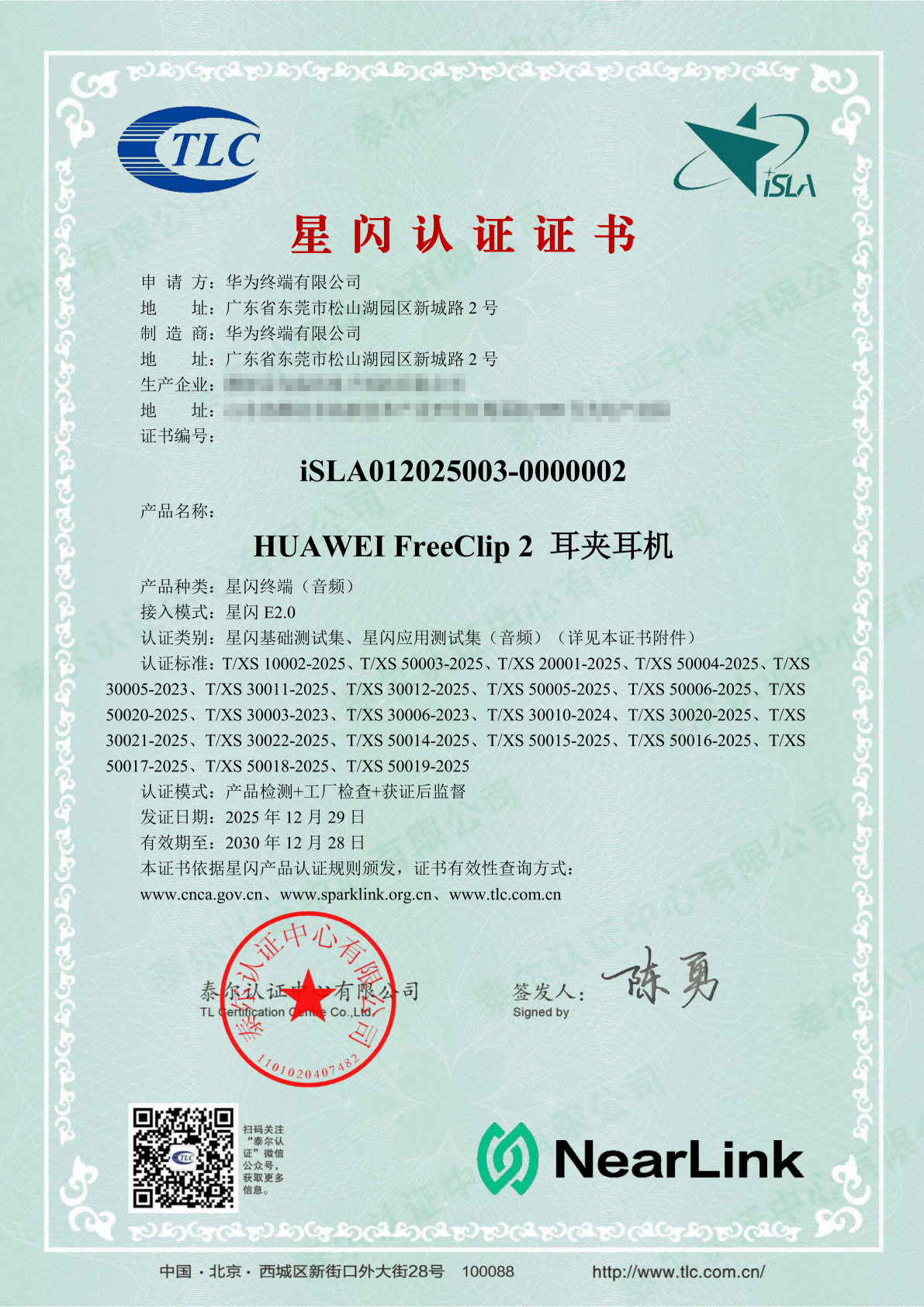 该认证证书由国际星闪无线短距通信联盟(以下简称“国际星闪联盟”)授权泰尔认证中心有限公司(以下简称“泰尔认证”)受理颁发。而此次两款产品所获证书,属于业内首批星闪认证证书,对应的证书编号分别为:iSLA012025003-0000001(FreeBuds Pro 5 悦彰耳机)、iSLA012025003-0000002(FreeClip 2 耳夹耳机)。