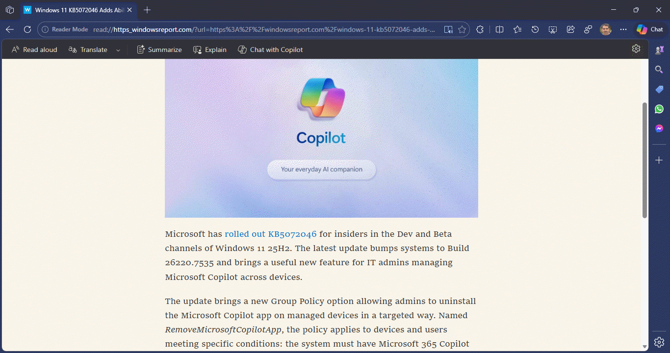 科技媒体 Windows Report 今天(1 月 10 日)发布博文,报道称在 Canary 频道最新 Microsoft Edge 浏览器版本中,微软正尝试重大改动:让 Copilot 全面接管“沉浸式阅读器”(Immersive Reader)界面。