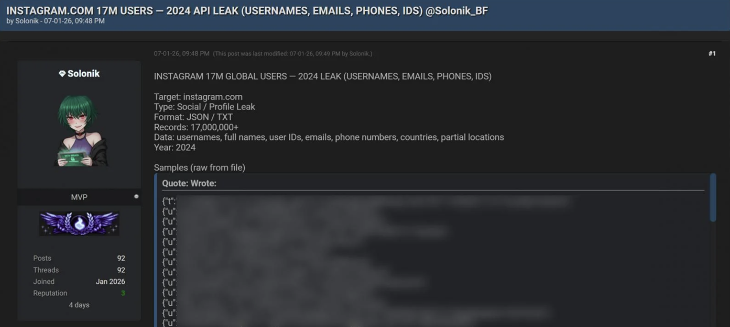 获悉,这场关于 Instagram 数据泄露的舆论风波,起因于网络安全公司 Malwarebytes 向客户发出警告,称有黑客窃取了多达 1750 万个 Instagram 账号的数据。随后,这批所谓的 Instagram 数据被免费发布在多个黑客论坛上,发布者声称数据来源于一次尚未得到官方确认的 2024 年 Instagram API 泄露事件。