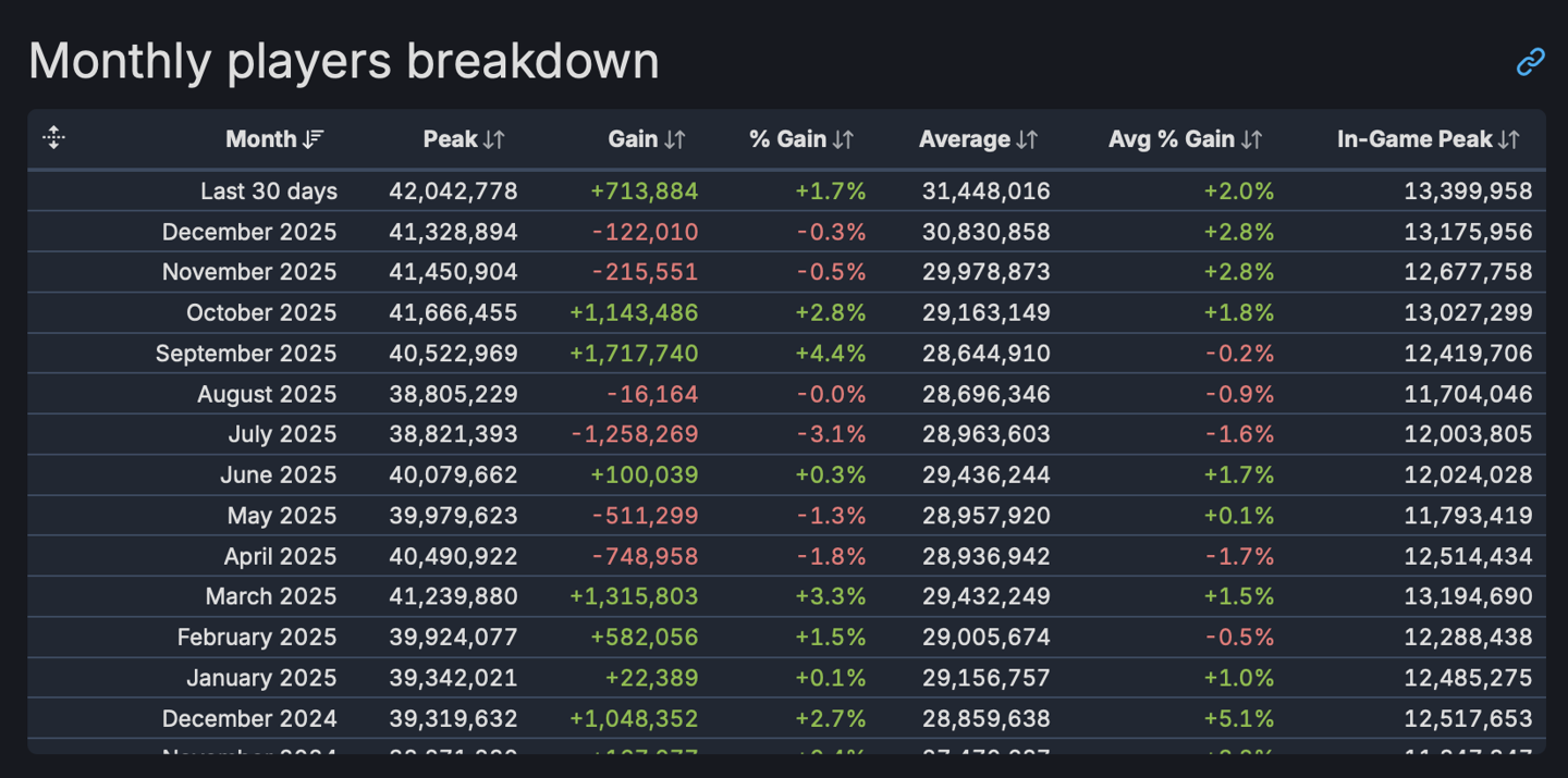 1 月 12 日消息,SteamDB 数据显示,2026 年伊始,继此前突破 4181 万人后,Steam 在线玩家峰值数昨日迎来新纪录,该平台近 24 小时用户在线峰值达到了 42,042,778 (约 4200 万人)。