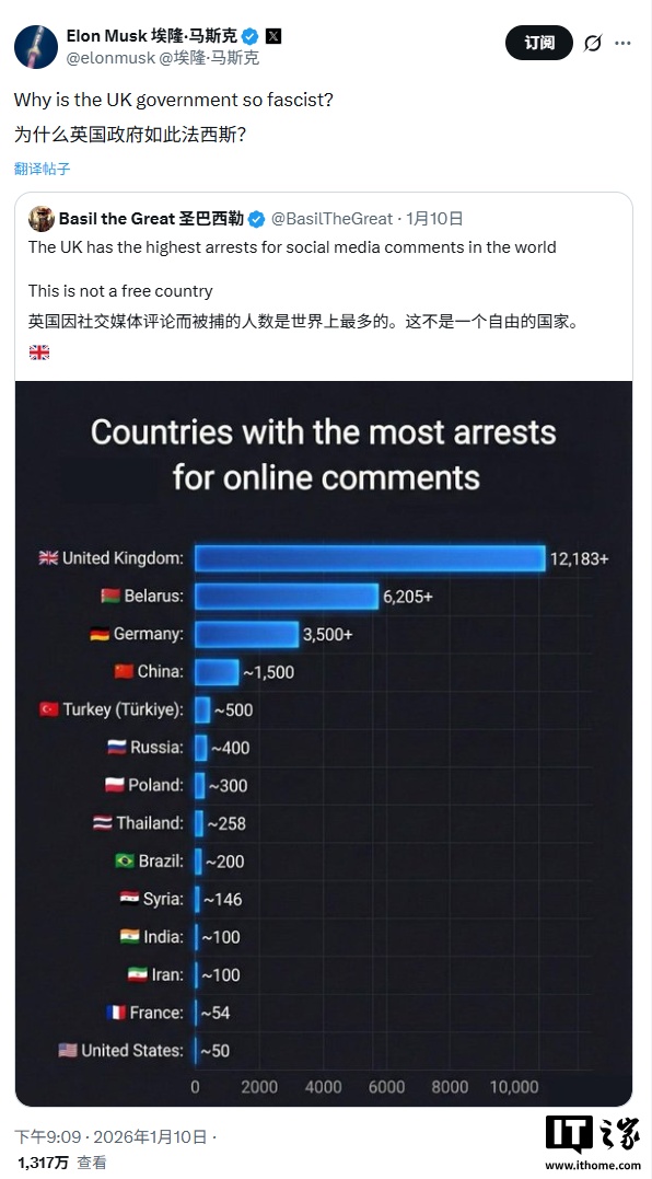 注意到,针对一张声称英国因社交媒体言论引发的逮捕数量全球最高的图表,马斯克发文质问:“英国政府为何如此法西斯化?”就在数小时前,马斯克还在另一条帖子中称英国企图“压制言论自由”,并将该国称作“监狱之岛”。