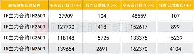 四大期指主力合约中,IH、IF、IM合约多空双方均加仓,IF、IM合约空头加仓数量较多。