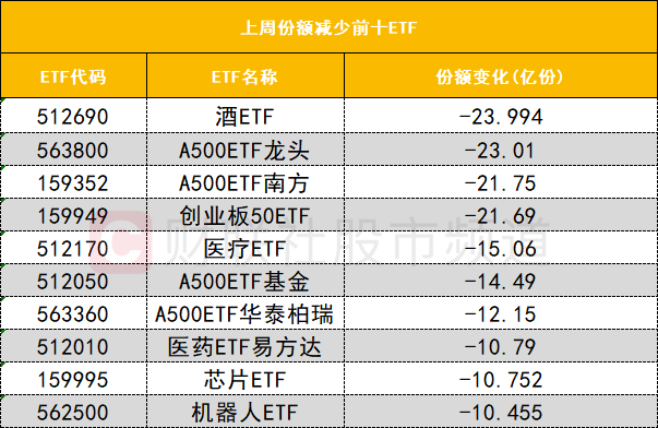 在上周份额减少前十的ETF中,多只中证A500相关ETF份额大幅减少,其中A500ETF龙头(563800)上周份额减少23.01亿份位居首位。A500ETF南方(159352)上周份额减少21.75亿份,A500ETF基金(512050)上周份额减少14.49亿份。