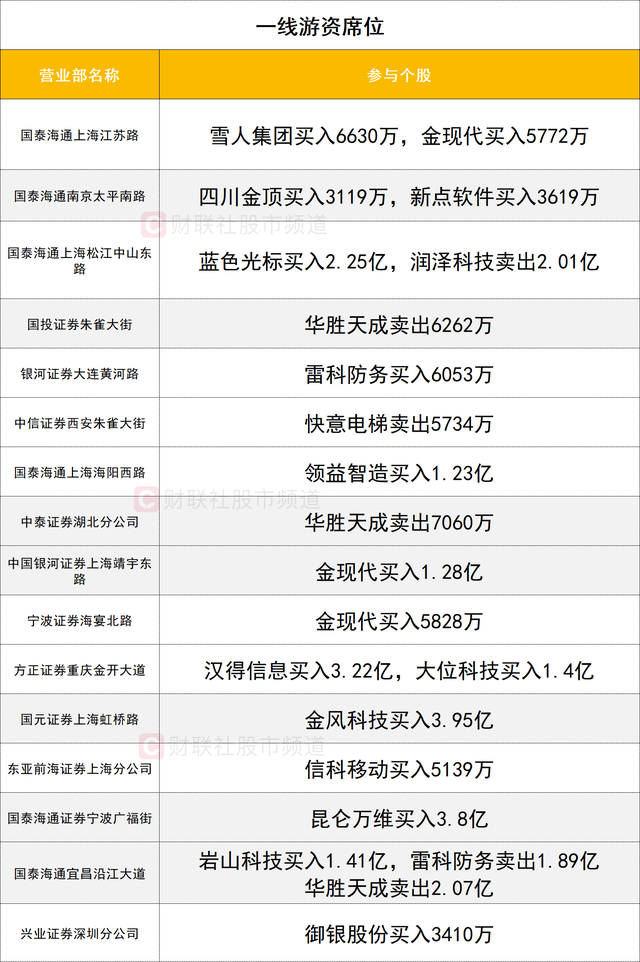 一线游资活跃度较高,昆仑万维获一家实力游资(国泰海通证券宁波广福街)买入3.8亿;蓝色光标获一家实力游资(国泰海通证券上海中山东路)买入2.25亿。金现代获三家游资(中国银河证券上海靖宇东路、宁波证券海宴北路、国泰海通上海江苏路)分别买入1.28亿、0.58亿、0.57亿。