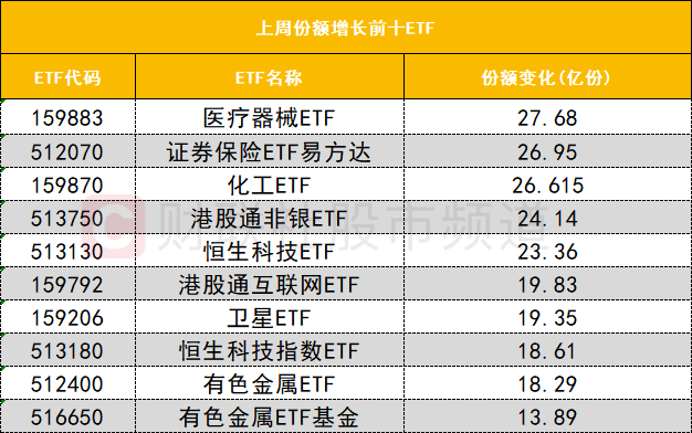 在上周份额增长前十ETF中,医疗器械ETF(159883)上周份额增长27.68亿份位居首位;证券保险ETF易方达(512070)上周份额增长26.95亿份位居次席。