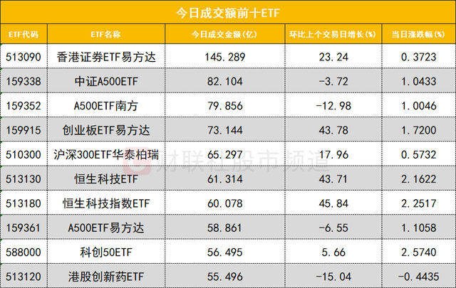从成交额前十的ETF来看,香港证券ETF易方达(513090)成交额位居首位,中证A500ETF(159338)成交额位居次席。
