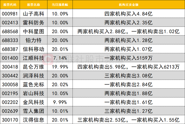 今日龙虎榜机构活跃度较高,买入方面,山子高科获四家机构买入4.84亿。商业航天人气股雷科防务获两家机构买入2.35亿。