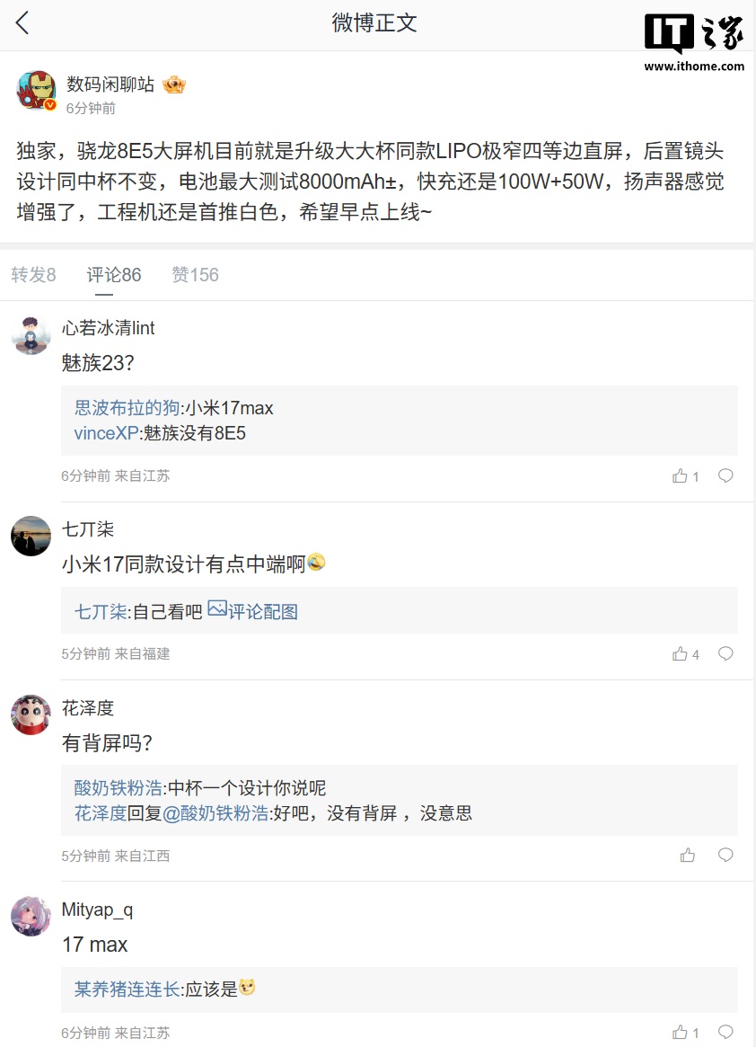 骁龙 8E5 大屏机配置曝光:LIPO 极窄四等边直屏,预计为小米 17 Max小米 17 Max
