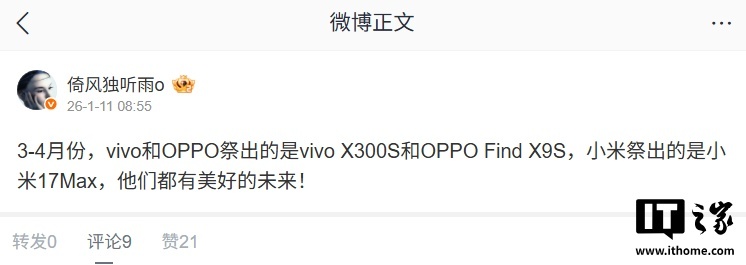 注意到,博主 @倚风独听雨 曾提到,一批国产新机将于今年 3-4 月集中发布,包括 vivo X300s、OPPO Find X9s、小米 17 Max 等,值得期待。