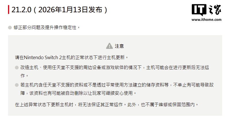 1 月 13 日消息,任天堂今日发布了 2026 年首个 Switch 与 Switch 2 系统更新,系统更新版本号为 21.2.0。