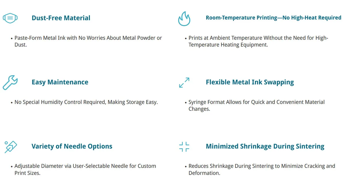 官方同时表示,可根据用户需求提供定制合金墨水材料。这些浆料在室温下通过挤压成型,摒弃了传统的高温与金属粉末方案。