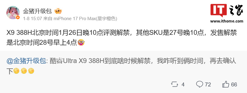在英特尔的酷睿 Ultra(第三代)处理器方面,笔记本电脑消息人士 @金猪升级包 在其微博动态中表示,旗舰型号酷睿 Ultra X9 388H 将于北京时间 1 月 26 日 22:00 评测解禁、其余型号 1 月 27 日 22:00 评测解禁,发售解禁时间是 1 月 28 日 04:00。