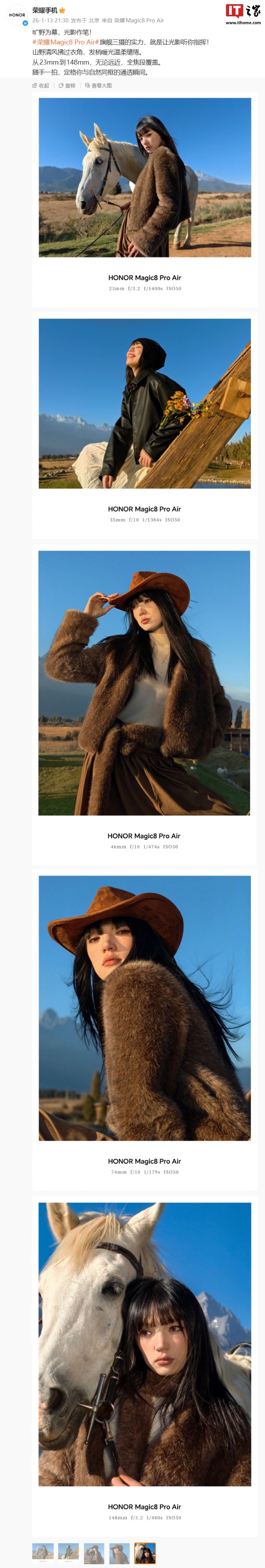 1 月 13 日消息,荣耀手机官方今日公布了 Magic8 Pro Air 的拍摄样张,宣称新机“从 23mm 到 148mm,无论远近,全焦段覆盖”。