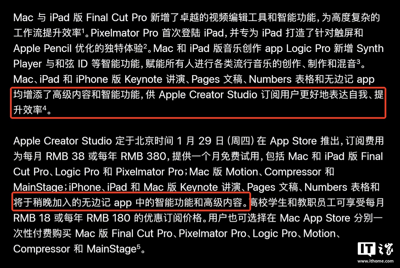 苹果在公告中明确指出,付费订阅将为用户带来显著的体验升级。订阅“Apple Creator Studio”的用户将在上述四款应用中获得全新的“智能功能”(Intelligent Features,预计为 AI 相关工具)以及高级内容。