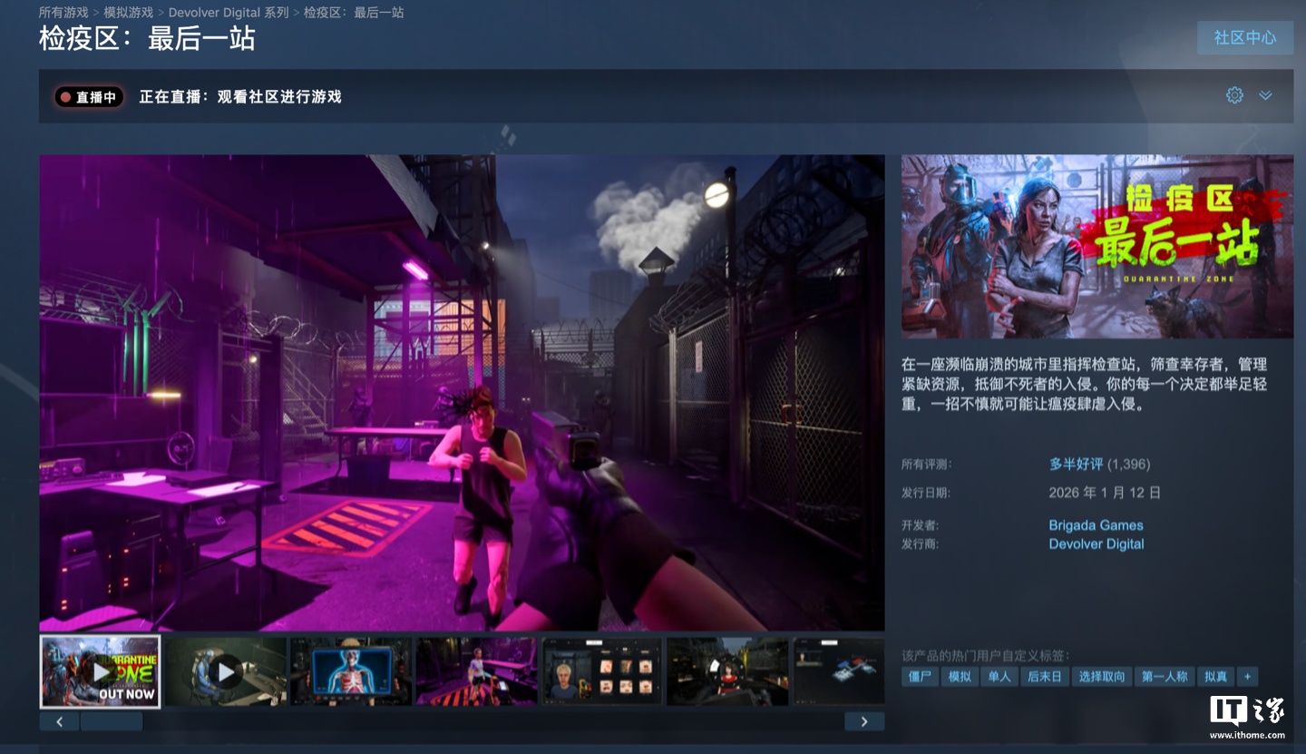 1 月 14 日消息,开发商 Brigada Games 宣布旗下游戏《检疫区:最后一站(Quarantine Zone: The Last Check)》现已正式发售,本作在 Steam 平台标准版价格为 68 元,2026 年 1 月 27 日前首发 9 折后到手价 61.2 元。游戏同步加入 PC Game Pass 游戏库,支持简体中文,附 Steam 商品页(https://store.steampowered.com/app/3419520/_/)。